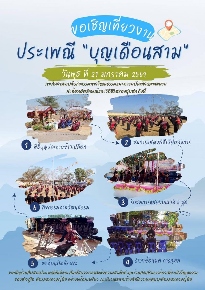 description ????ขอเชิญร่วมงานประเพณีบุญเดือนสาม ตำบลหนองหญ้าไซ ประจำปี 2569 เทศบาลตำบลหนองหญ้าไซ อำเภอวังสามหมอ จังหวัดอุดรธานี ขอเชิญประชาชนและนักท่องเที่ยวร่วมงาน ประเพณีบุญเดือนสาม ประจำปี 2569 ในวันพุธ ที่ 21 มกราคม พ.ศ. 2569 ณ บริเวณสนามข้างสำนักงานเทศบาลตำบลหนองหญ้าไซ ภายในงานพบกับกิจกรรมทางวัฒนธรรมและความบันเทิงหลากหลาย สะท้อนอัตลักษณ์และวิถีชีวิตของชุมชน ดังนี้ - พิธีบุญประทายข้าวเปลือก - ชมการแสดงพิธีเปิดอย่างสุดอลังการ - รับชมการแสดงบนเวที จากหมู่บ้าน จำนวน 8 ชุดการแสดง - รำวงย้อนยุค การกุศล ขอเชิญร่วมสืบสานประเพณีอันดีงาม สัมผัสบรรยากาศแห่งความสามัคคี และร่วมส่งเสริมการท่องเที่ยวเชิงวัฒนธรรมของชาวภูไท ตำบลหนองหญ้าไซ อย่างพร้อมเพรียง person admin