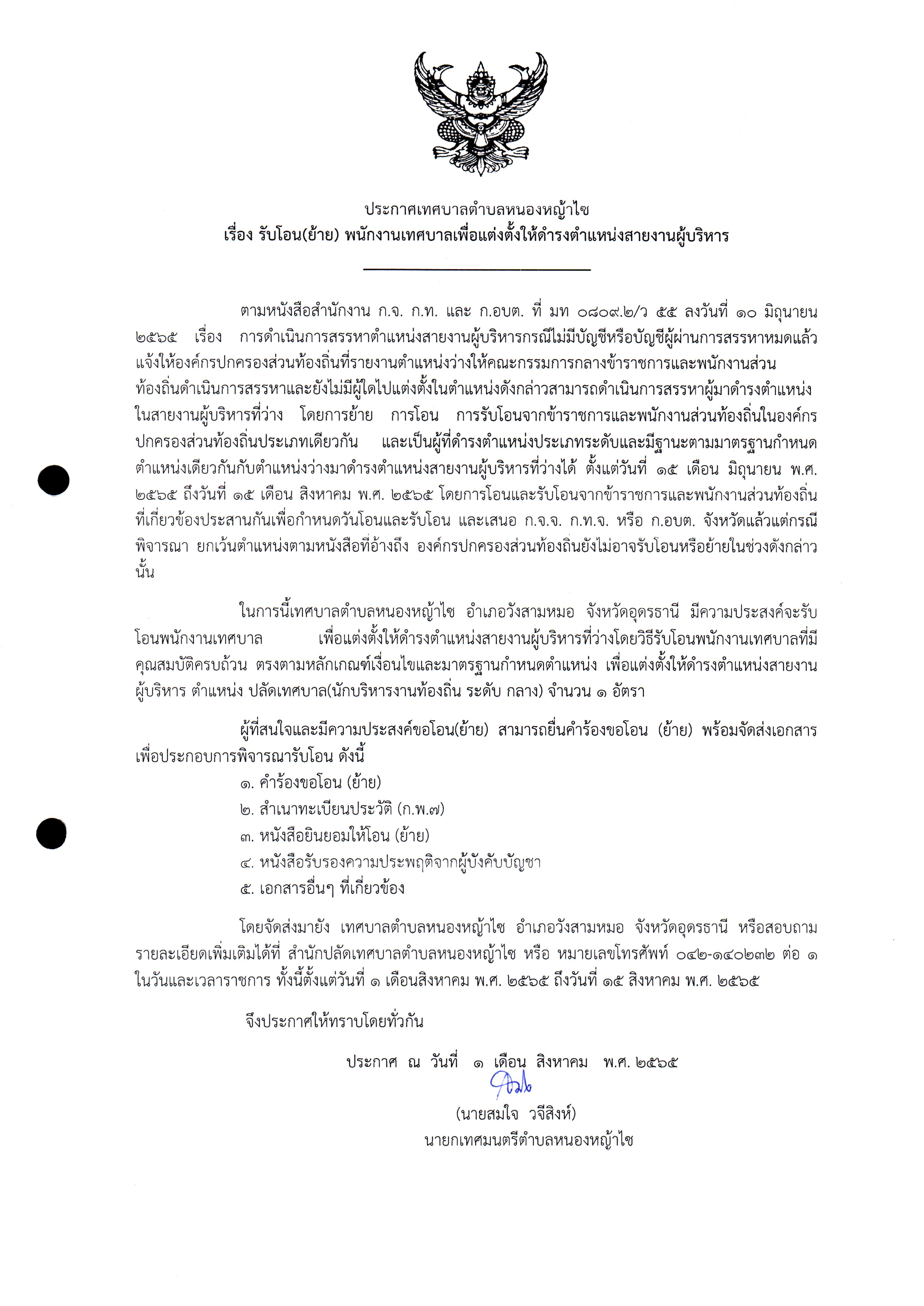 ประกาศเทศบาลตำบลหนองหญ้าไซ เรื่อง รับโอน(ย้าย) พนักงานเทศบาลเพื่อแต่งตั้งให้ดำรงตำแหน่งสายงานผู้บริหาร
