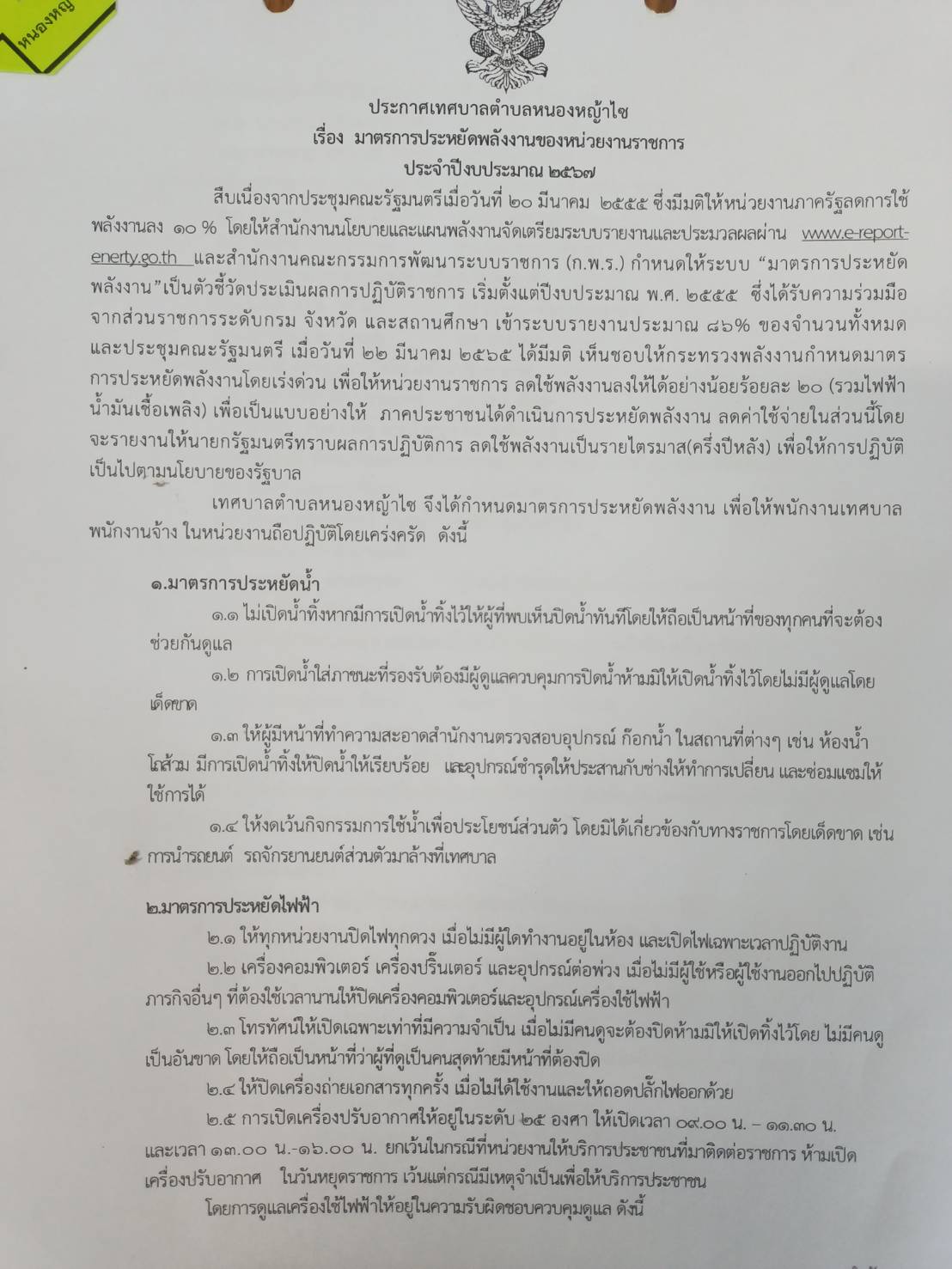 มาตรการประหยัดพลังงานเทศบาลตำบลหนองหญ้าไซประจำปีงบประมาณ2567