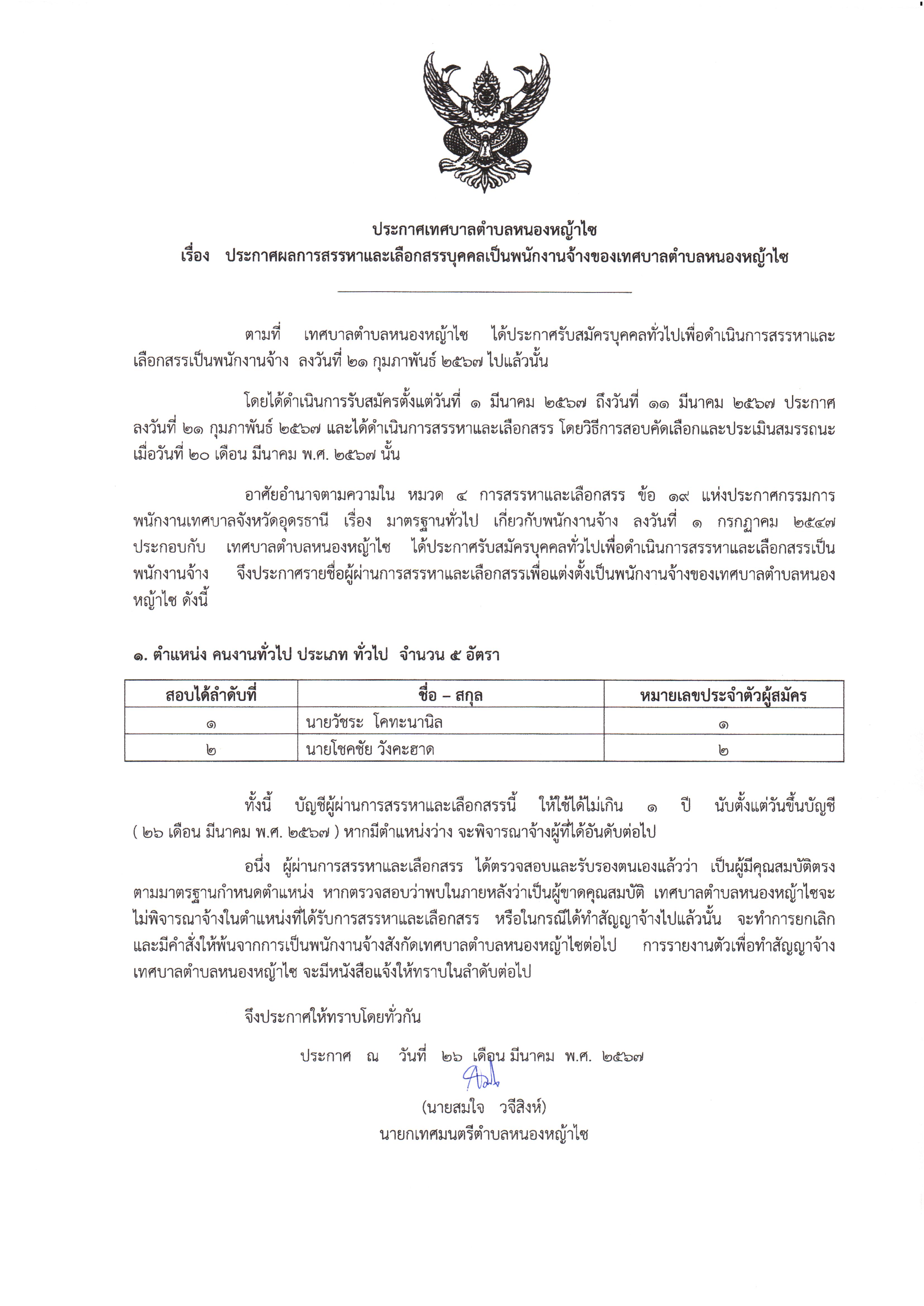 ประกาศเทศบาลตำบลหนองหญ้าไซ เรื่อง ประกาศผลการสรรหาและเลือกสรรบุคคลเป็นพนักงานจ้างของเทศบาลตำบลหนองหญ้าไซ